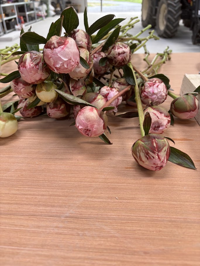 We grow three peony varieties: Sarah Bernhardt (pink), Red Sarah Bernhardt, and Duchess de Nemours (white). These varieties were carefully selected for their colour range, strong stems and proven performance, as well as their suitability for the soil conditions and weather typical of the west of Ireland, ensuring consistent quality year after year.